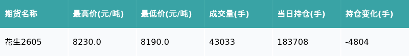 南财智讯3月24日电,盘后期货数据显示,郑州商品交易所的花生主力合约收跌0.32%,收盘报8214.0元/吨,日内资金流出3078.9万元。其他相关指标见下表: